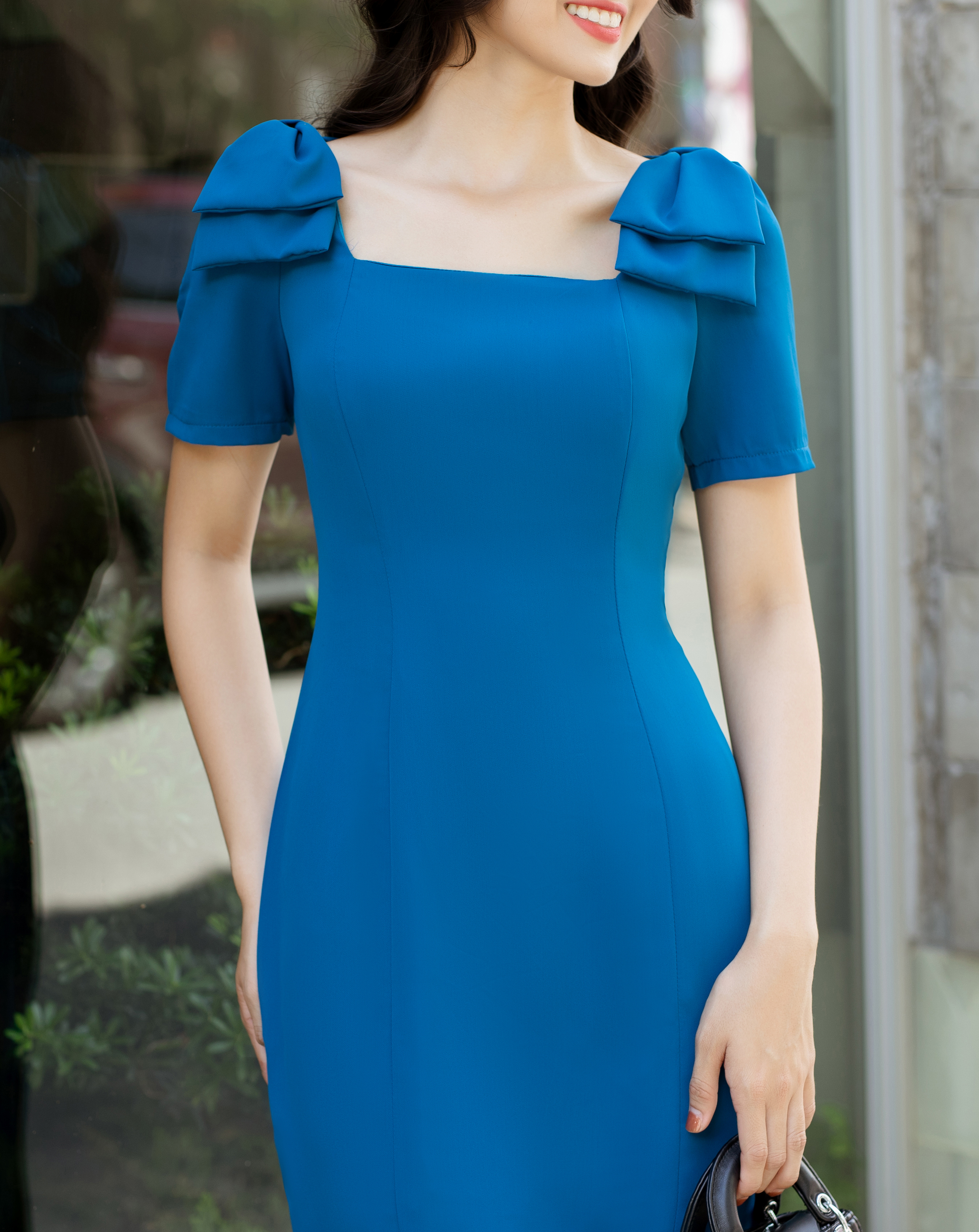 Đầm body cổ U phối nơ vai thanh lịch
