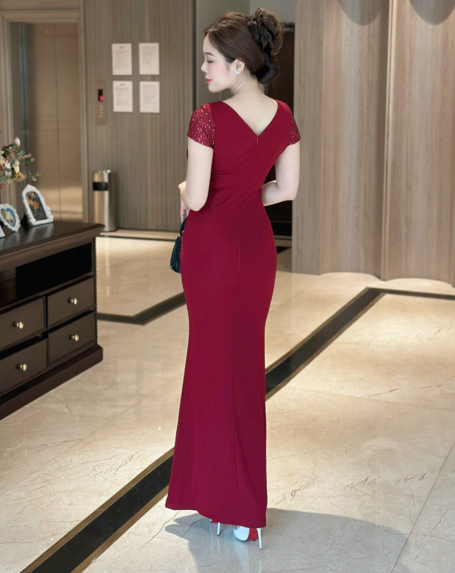 Đầm dạ hội phối Sequin cổ V chéo eo xẻ đùi sang trọng
