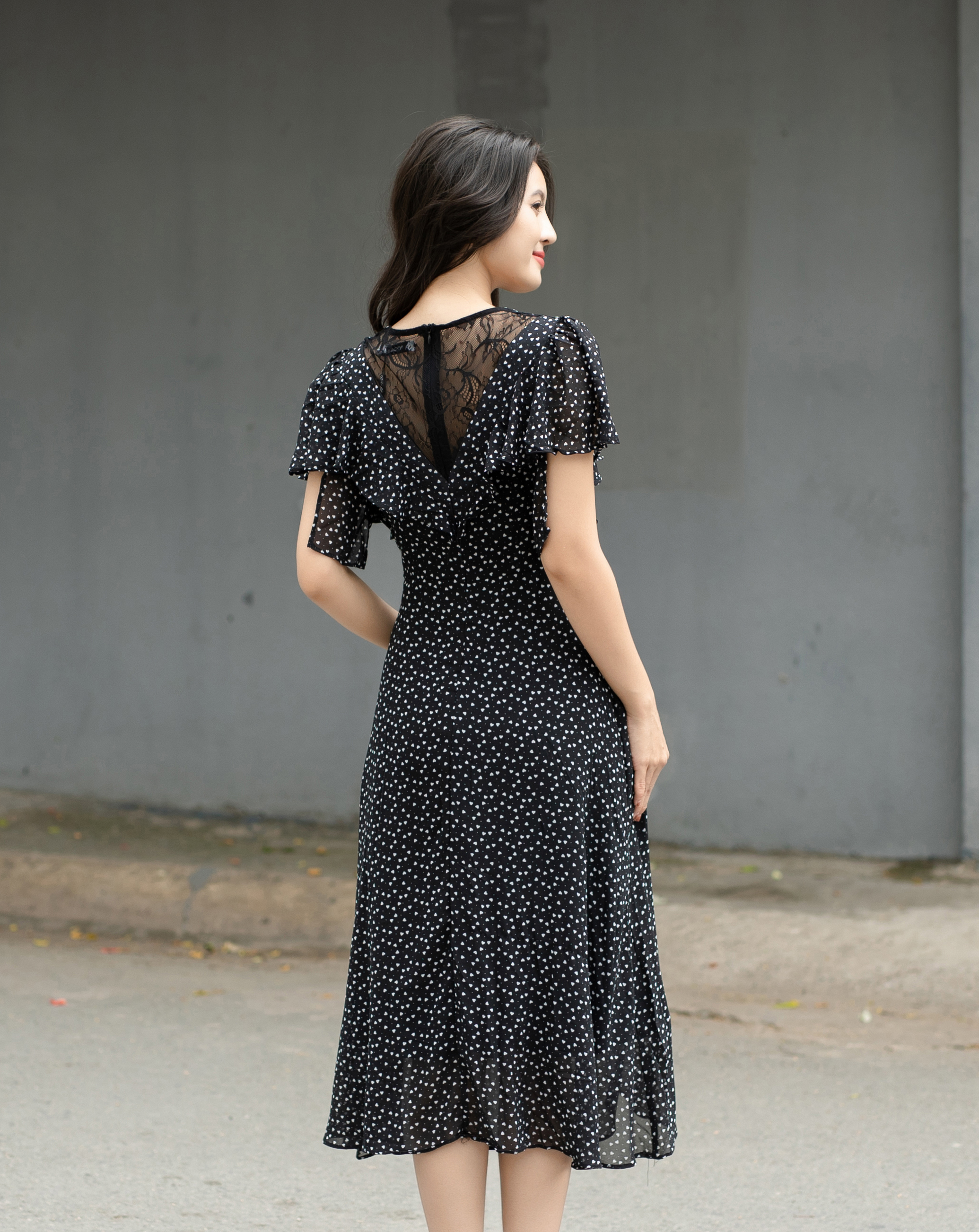 Đầm midi họa tiết tim nhí cổ V phối ren lưng