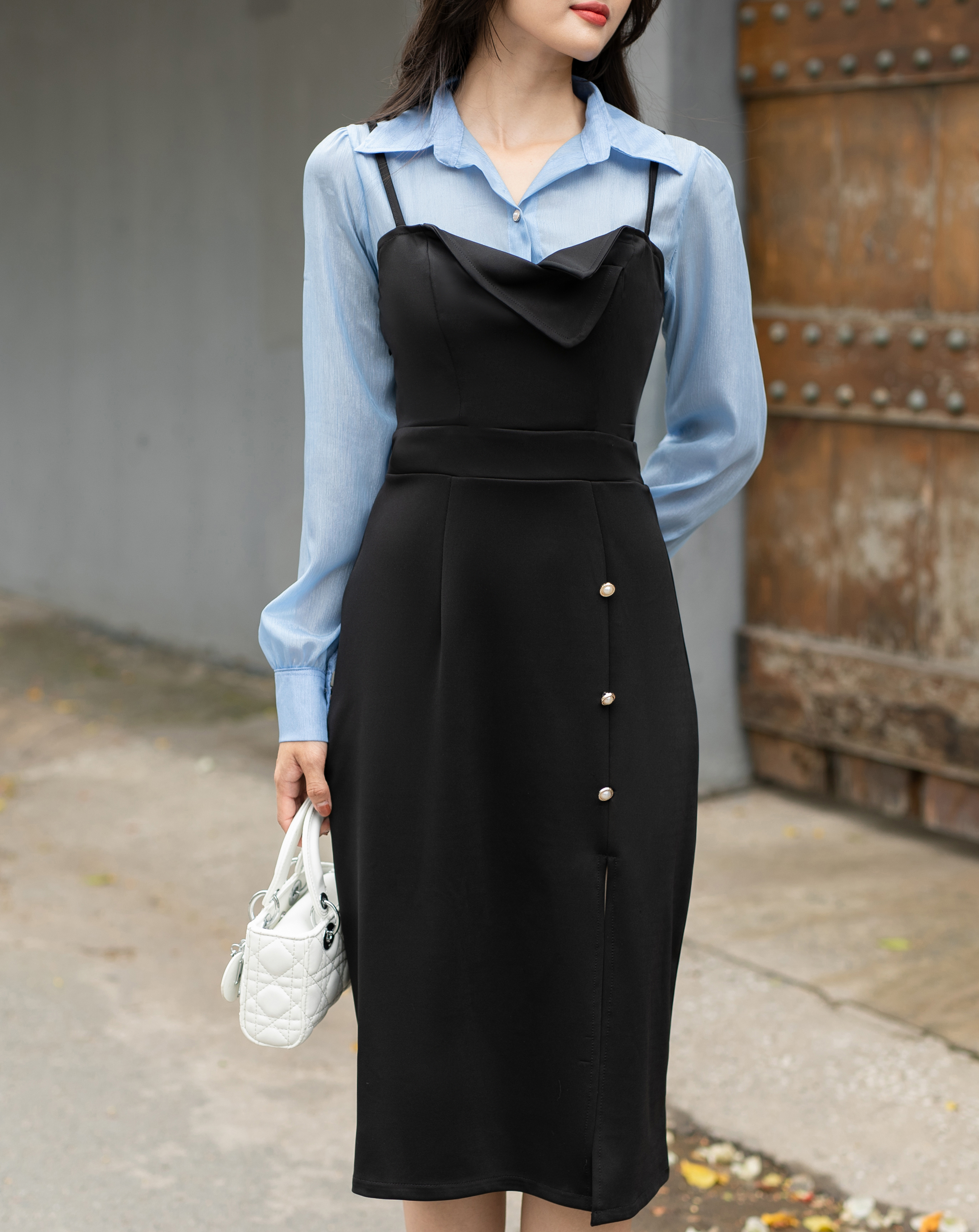 Đầm thiết kế hai dây giả yếm cổ điển kiểu Pháp