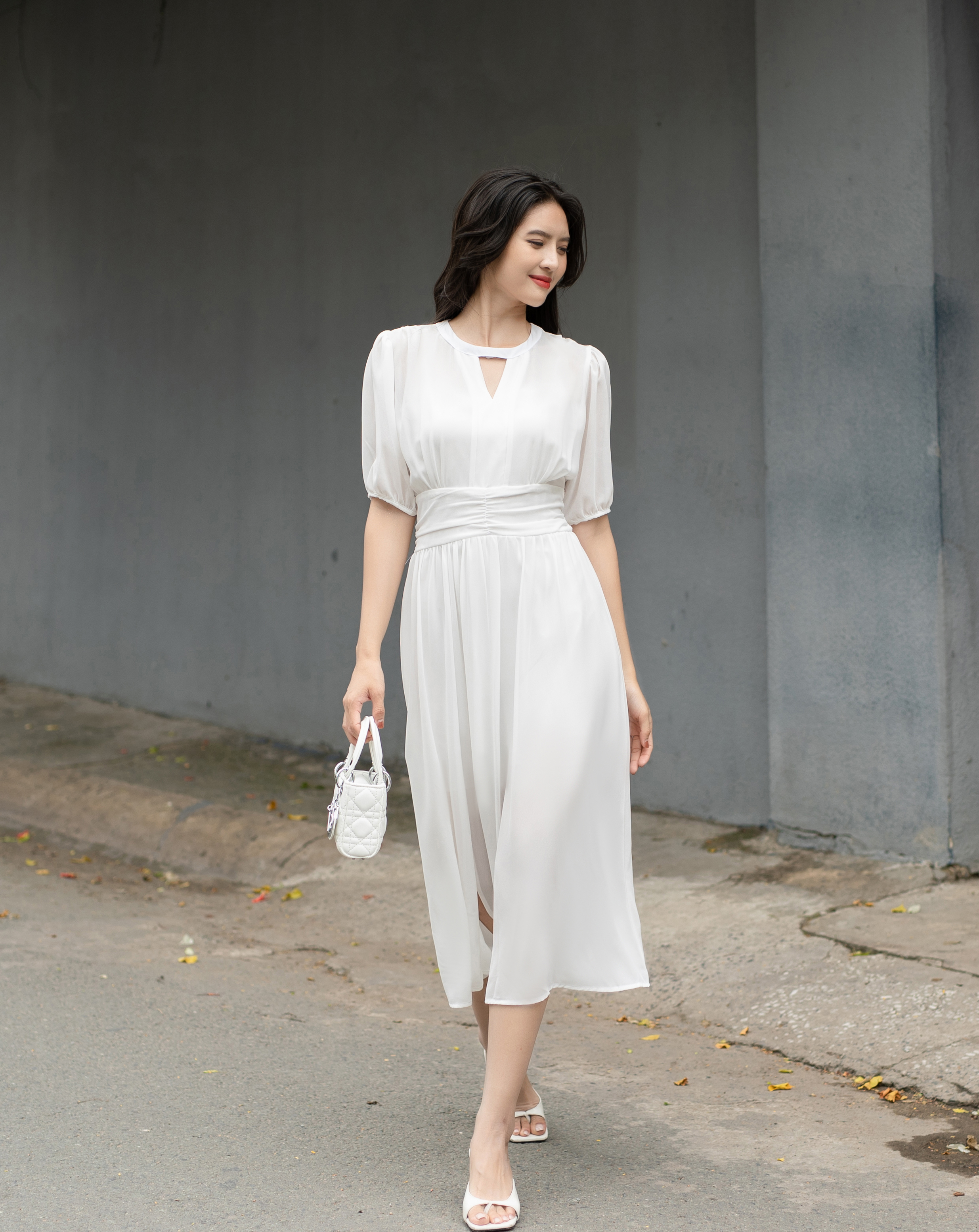 Đầm voan xòe cổ giọt nước xẻ tà xinh xắn