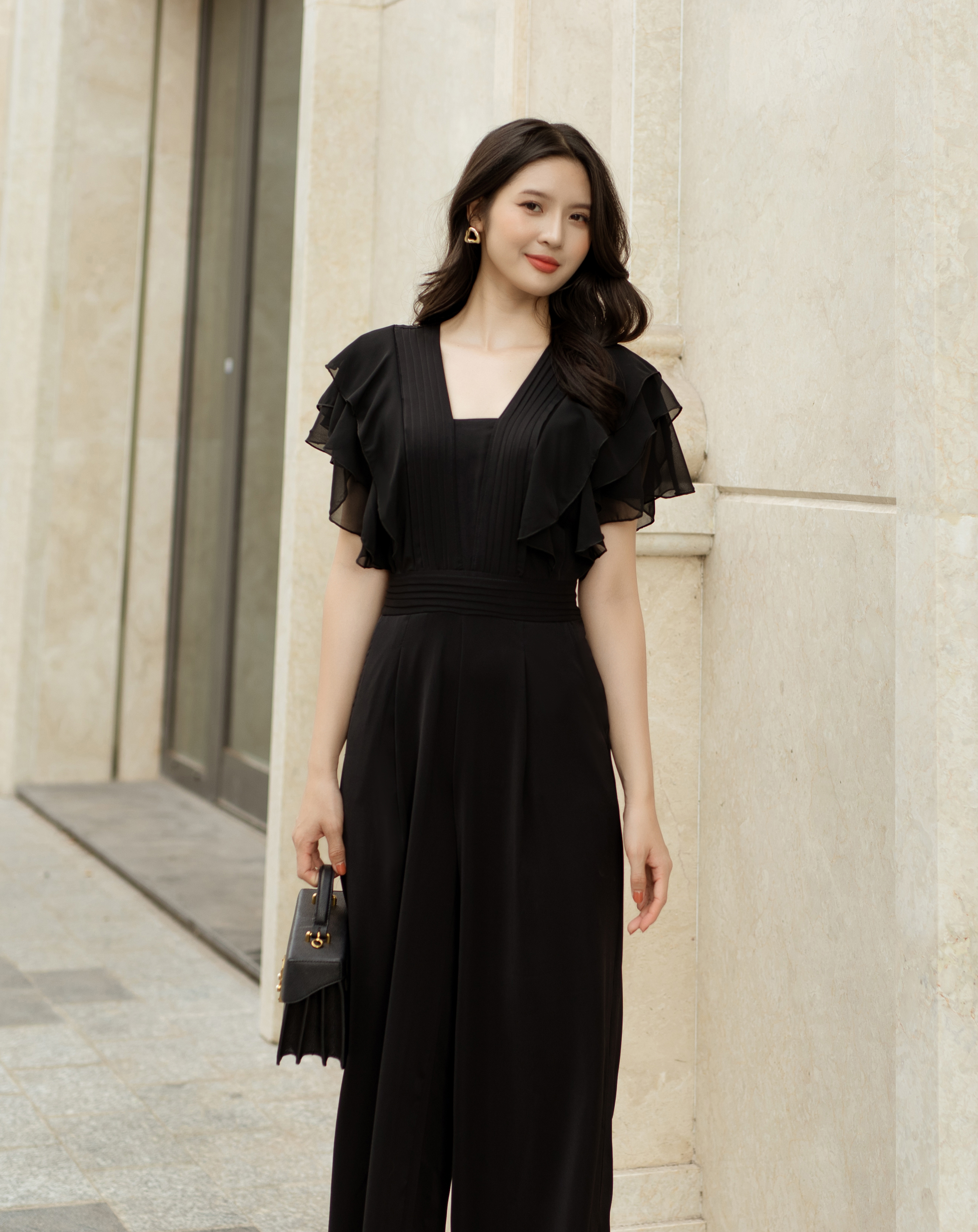 Jumpsuit ống suông xếp ly tay cánh tiên