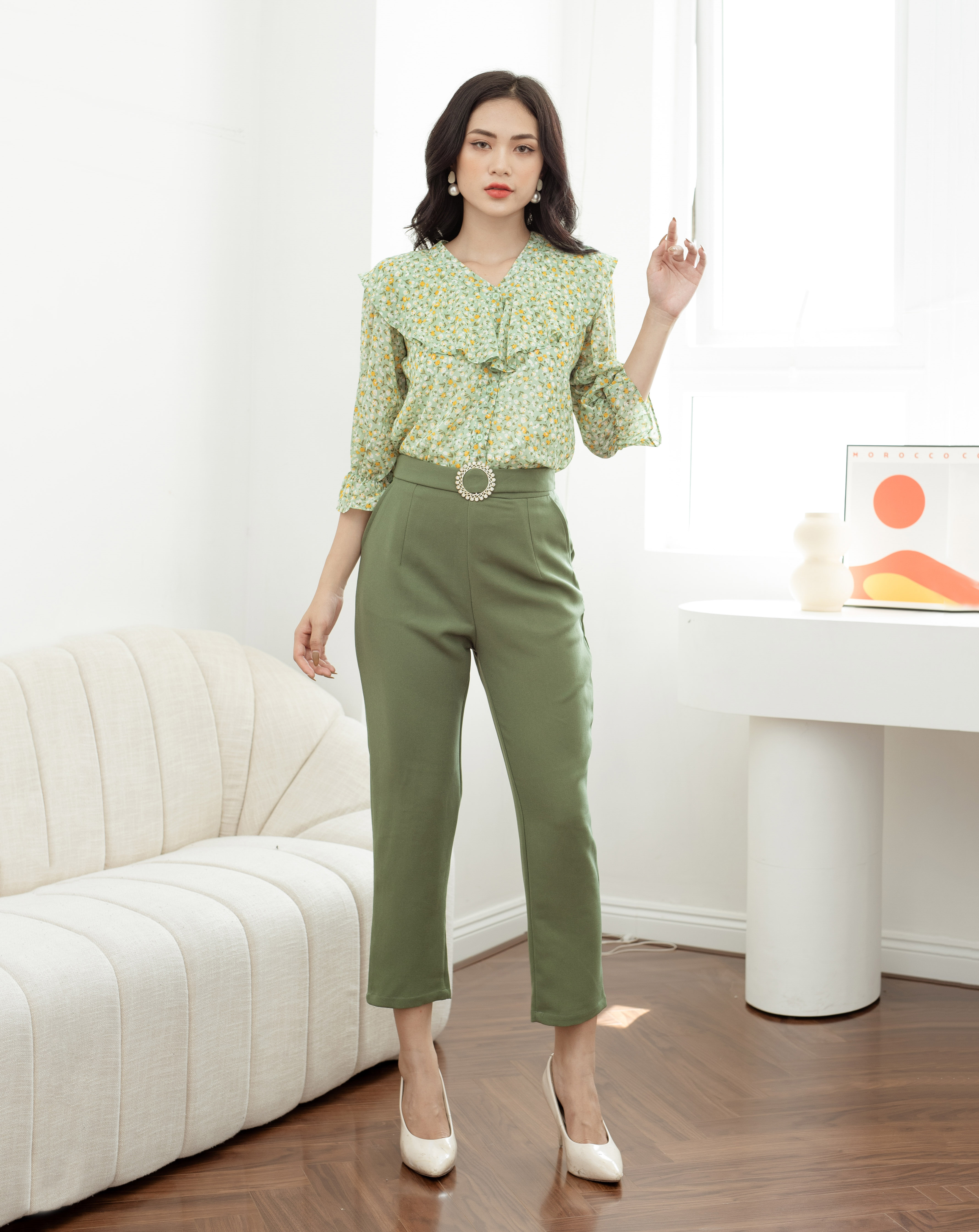 Màu xanh thanh lịch mang đến vẻ trẻ trung và tươi mới cùng kiểu dáng áo có tay và phối quần dài lưng cao tạo nên vẻ đẹp thanh thoát và nữ tính. Với hoa văn trên áo, Set bộ phong cách này thích hợp cho các buổi làm việc công sở, dự tiệc, party, event hoặc thậm chí đi chơi.
