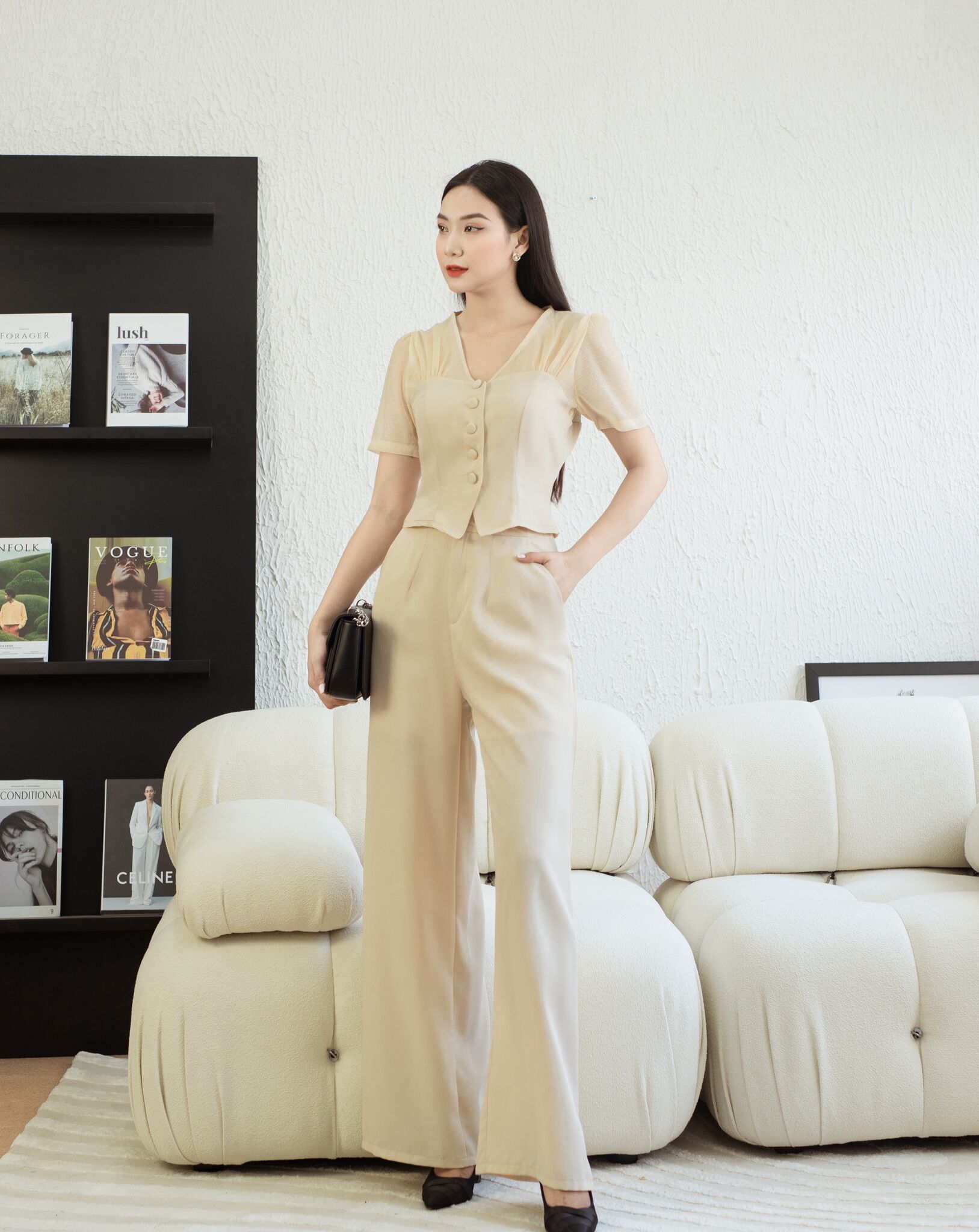 Áo có thiết kế tay con và cổ V cài nút, tạo điểm nhấn cho phần trên cơ thể. Quần có lưng cao và ống rộng, tôn lên đường cong và tạo sự thon gọn cho nàng.