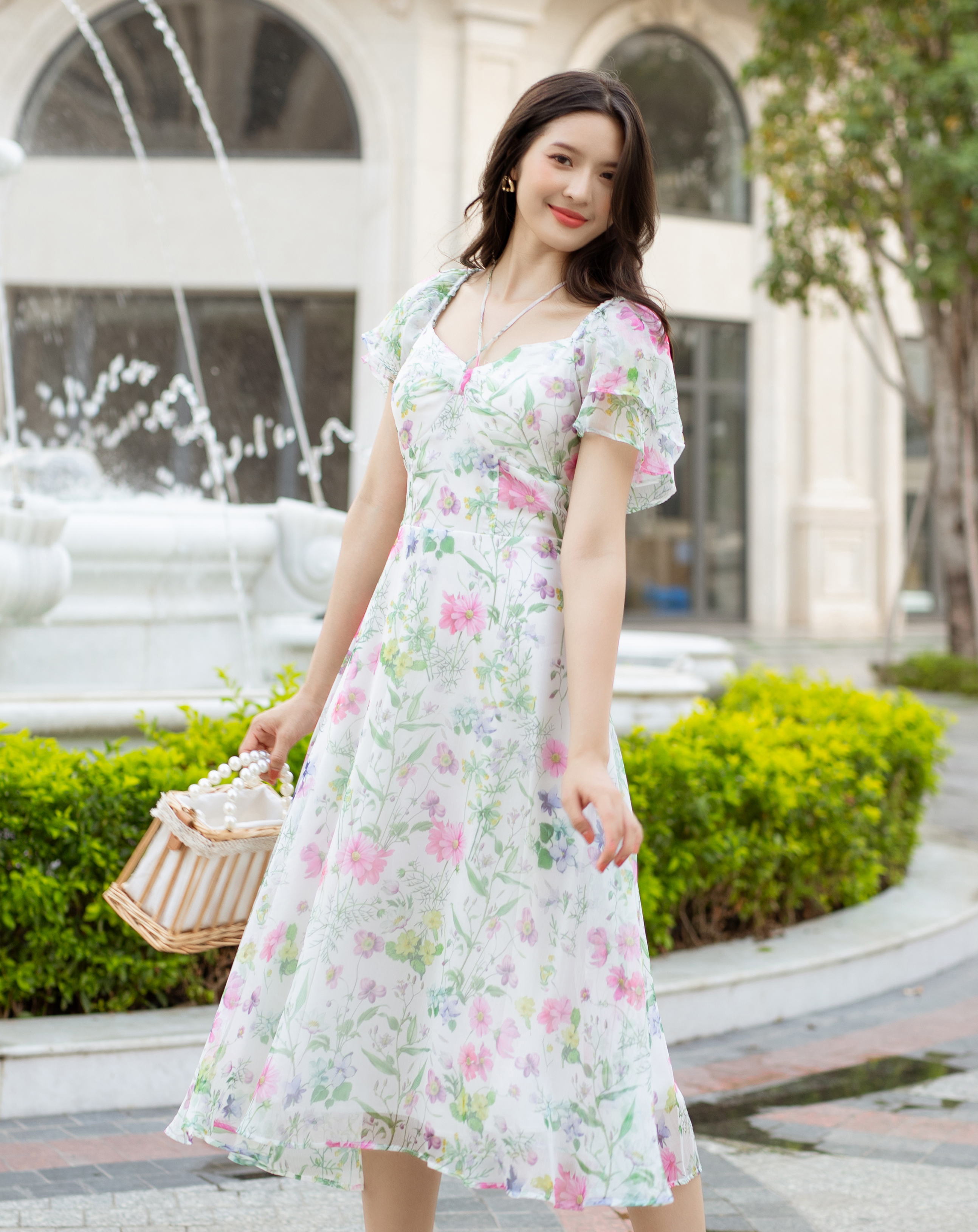 Váy hoa tay cánh tiên cổ V dây đan chéo